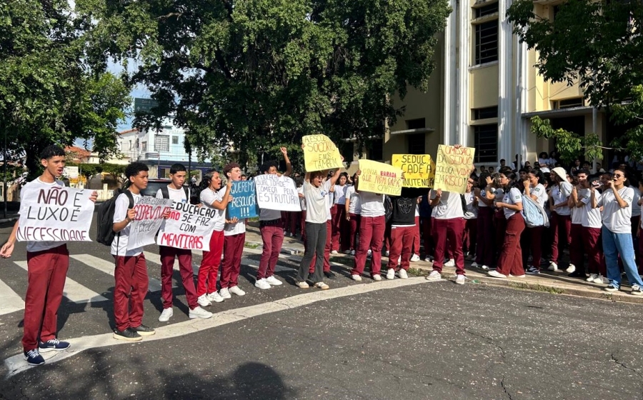 O grupo saiu em passeata pelas ruas do Centro da capital e seguiu em direção à 4ª Gerência Regional de Educação, órgão responsável pela gestão da escola, com o objetivo de chamar a atenção das autoridades e pressionar por soluções.