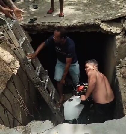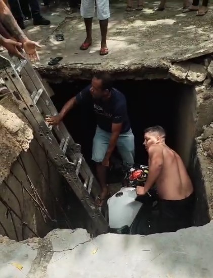 Imagens que circulam nas redes sociais mostram o momento do resgate, feito por populares que improvisaram uma escada para retirar o homem e as crianças do buraco. A motocicleta também caiu na cratera, e moradores tentaram removê-la.