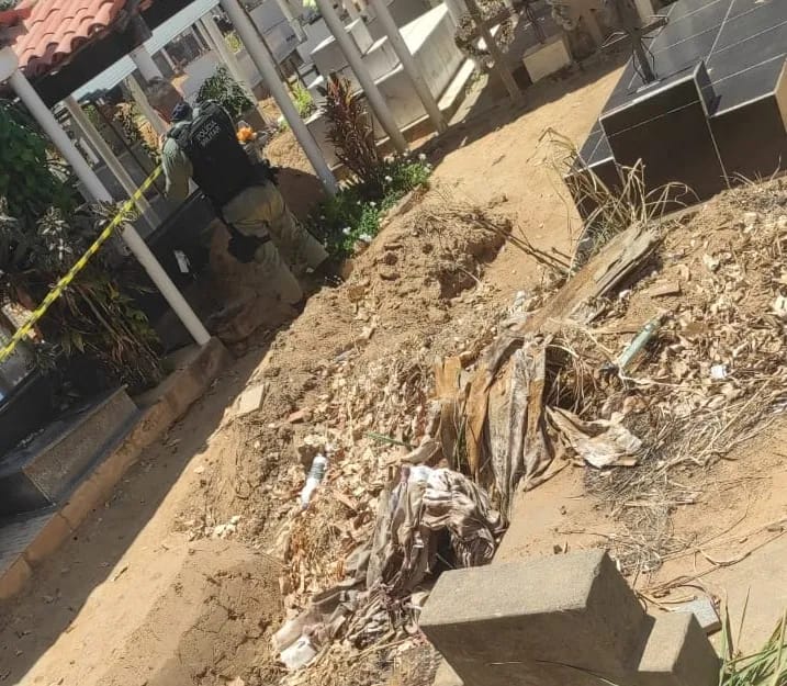 No local, os policiais constataram que um túmulo havia sido violado e que o corpo retirado do espaço foi deixado do lado de fora.
