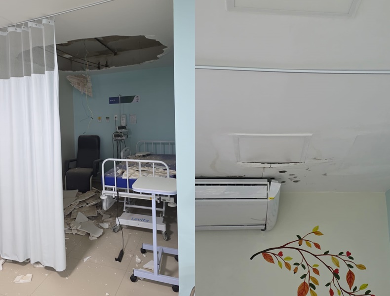Imagens compartilhadas nas redes sociais mostram um grande buraco no teto e destroços de gesso espalhados pelo chão e sobre uma cama hospitalar utilizada por pacientes.