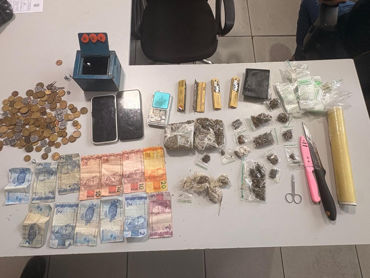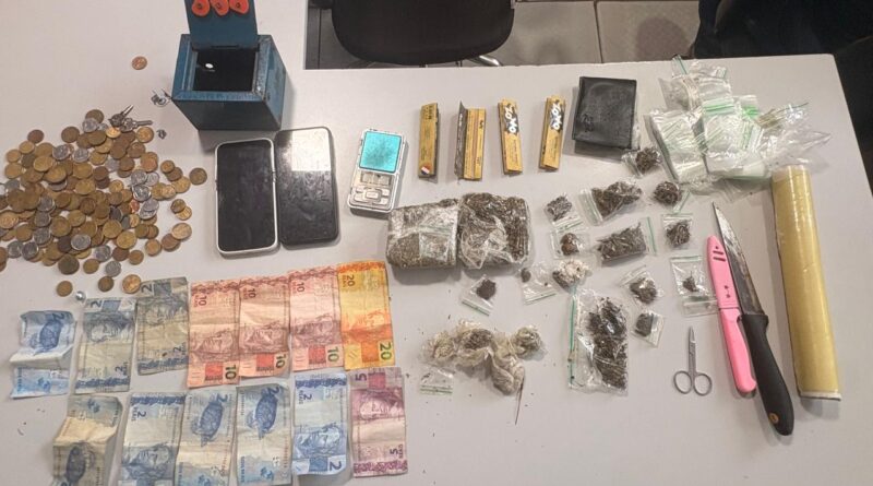 Diante da atitude suspeita, os policiais realizaram a abordagem. Durante a verificação do material, foram encontrados invólucros de maconha e skunk prontos para comercialização, além de uma balança de precisão, uma faca e uma quantia em dinheiro.