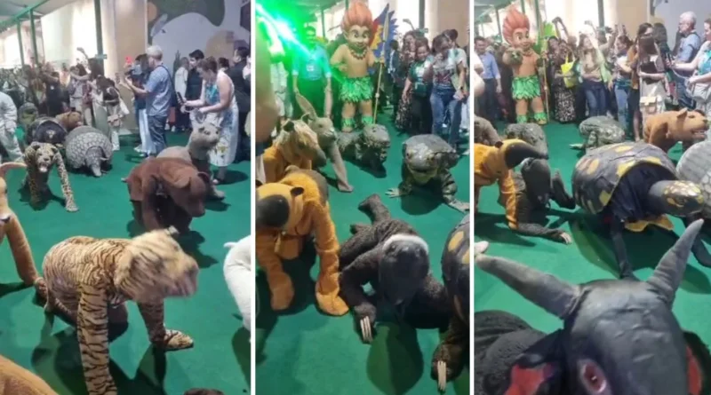 Um grupo de atores, vestidos como animais da fauna brasileira, desfilou e rastejou pelo espaço. A cena, porém, gerou espanto e risadas do público, especialmente pela presença de um urso polar, figura totalmente alheia ao ecossistema amazônico.