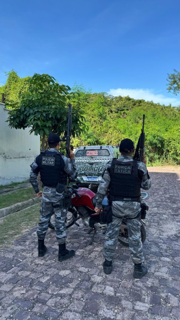 Durante patrulhamento, os policiais foram informados via rádio sobre uma moto tomada de assalto por quatro suspeitos. O veículo, uma Honda Fan 160 Start, foi localizado abandonado na Rua Vitorino Orthigues Fernandes. Com auxílio do rastreamento, o proprietário acompanhava a movimentação da moto e foi acionado para reaver o bem.