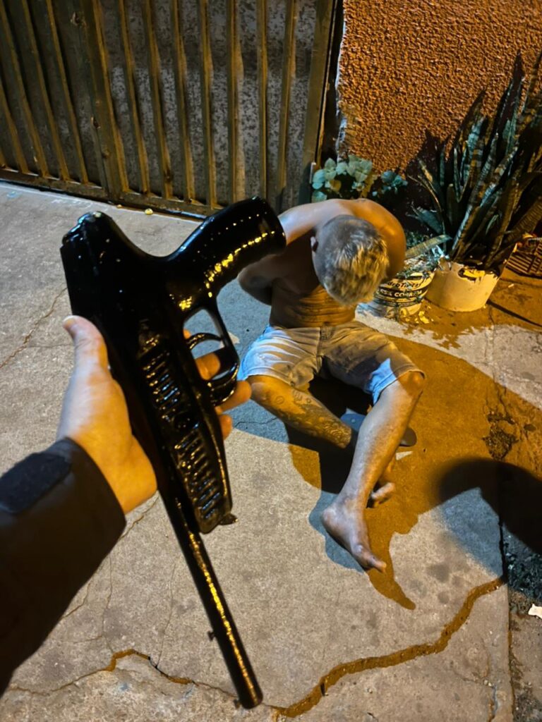 Ao perceber a aproximação da guarnição, o suspeito tentou se desfazer do objeto, jogando-o ao chão. Durante a abordagem, os militares constataram que se tratava de um simulacro, confeccionado com partes de uma arma de chumbinho, apresentando aparência semelhante à de uma pistola, porém sem capacidade de funcionamento.